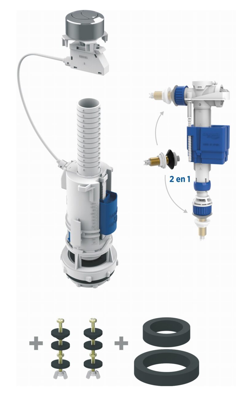 Mecanismo doble pulsador de CABLE modelo Denia, con tornillos taza tanque HB y GOMA asiento + grifo de alimentación INFERIOR O LATERAL modelo Duo. En